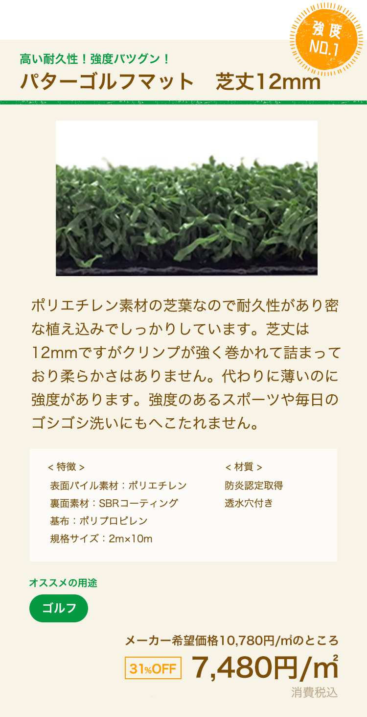 GOLF用の場合、表面排水になっているなど、用途によって人工芝を使い分けています。