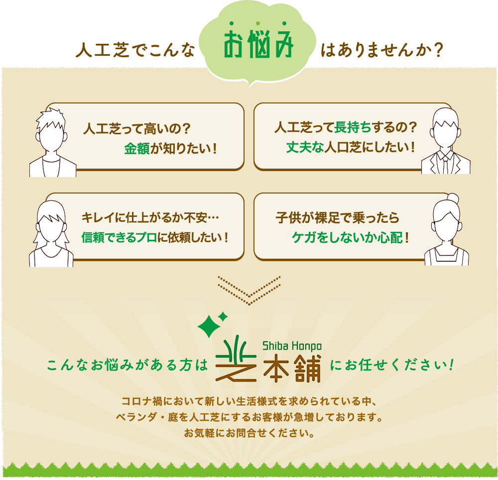私たちは高品質な人工芝をたくさんの方に提供したいという思いから、高品質で自身の商品をお求めやすいお値段で販売しています!