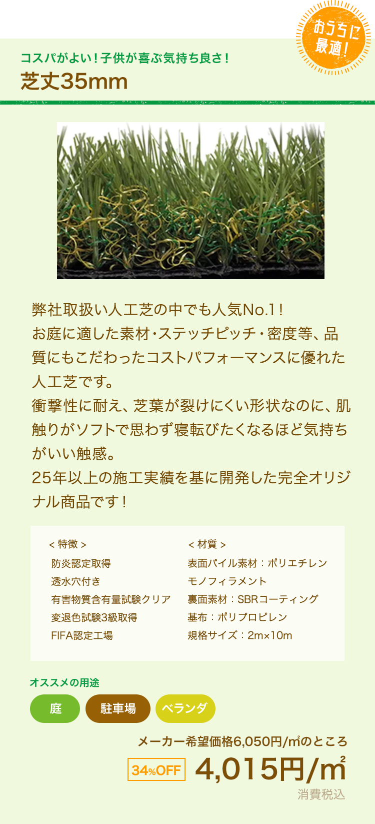 私たちは高品質な人工芝をたくさんの方に提供したいという思いから、高品質で自身の商品をお求めやすいお値段で販売しています!