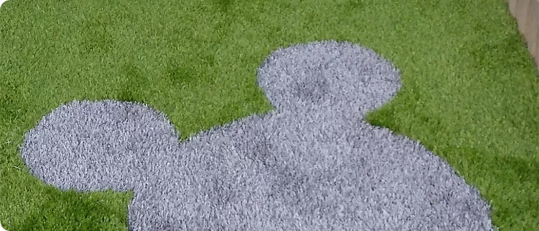 もともと土だった庭の一部を、お子様が走り回れるようにキャラクター風シルエットを入れた人工芝にしました。